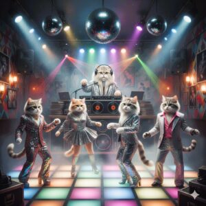 (Disko-jumputus kuuluu taustalla ja kissojen puheensorinaa.)