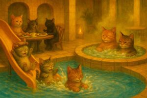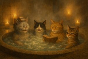 Kylpylän ovet avautuivat, ja lämmin kissanminttutuoksu leijui vastaan. Kissalan porukka asteli sisään kuin kuninkaalliset, tassut pehmeästi tohveleissa kuin silkkiset liinat, silmät uteliaina kiiluen. Höyry täytti pukuhuoneen ilman, ja taustalla kuului veden loisketta, sekä hiljaista musiikkia. Jokainen kissa hengitti syvään ja tunsi arjen jäävän taakse.