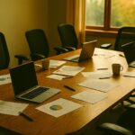 (Pirjo menee tekemään valmisteluja neuvotteluhuoneeseen ja Taina tuo kahvit tullessaan.)